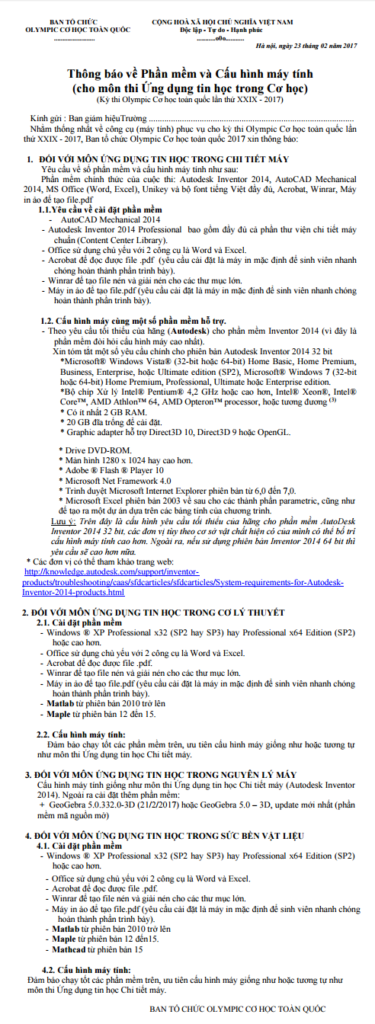 Văn bản này áp dụng cho các thí sinh tham gia kỳ thi Olimpic Cơ học 2017 cho môn thi Ứng dụng tin học trong Cơ học (Cơ kỹ thuật, Nguyên lý máy, Chi tiết máy, Sức bền vật liệu).