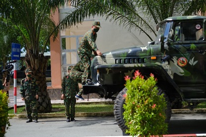 Đại tá Trần Hồng Thanh – Hiệu trưởng Nhà trường giao nhiệm vụ, động viên và nhắc nhỡ các đồng chí trong tổ sửa chữa, cứu kéo phục vụ cho nhiệm vụ phòng chống dịch của Bộ Quốc Phòng