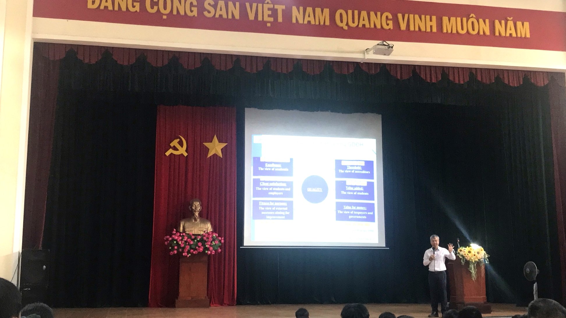 Hội nghị rất vinh dự được đón tiếp Tiến sĩ Nguyễn Quốc Chính, Giám đốc Trung tâm Khảo thí và đánh giá chất lượng đào tạo, Đại học Quốc gia TP HCM cùng giới thiệu và trao đổi các nội dung liên quan đến công tác đảm bảo chất lượng đào tạo.