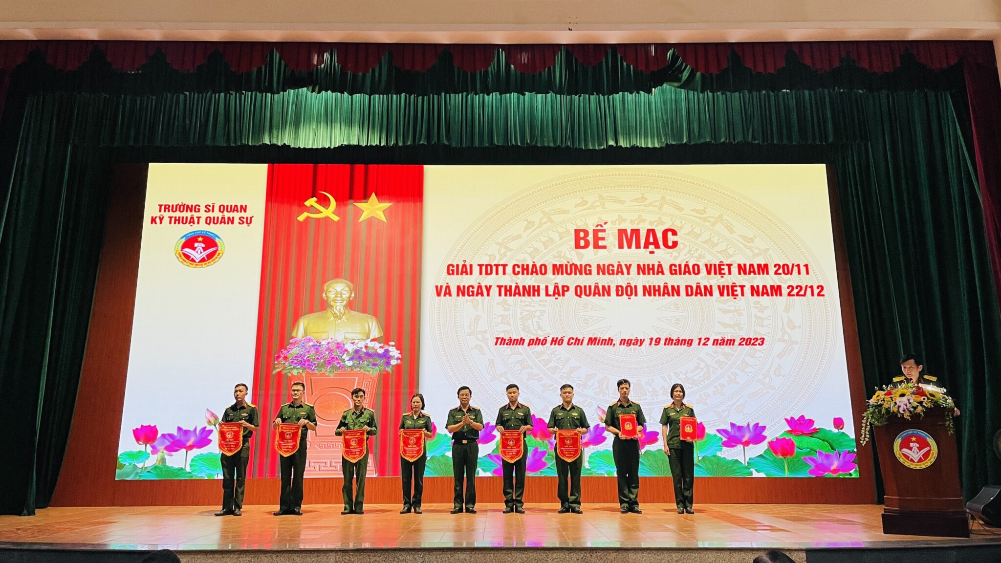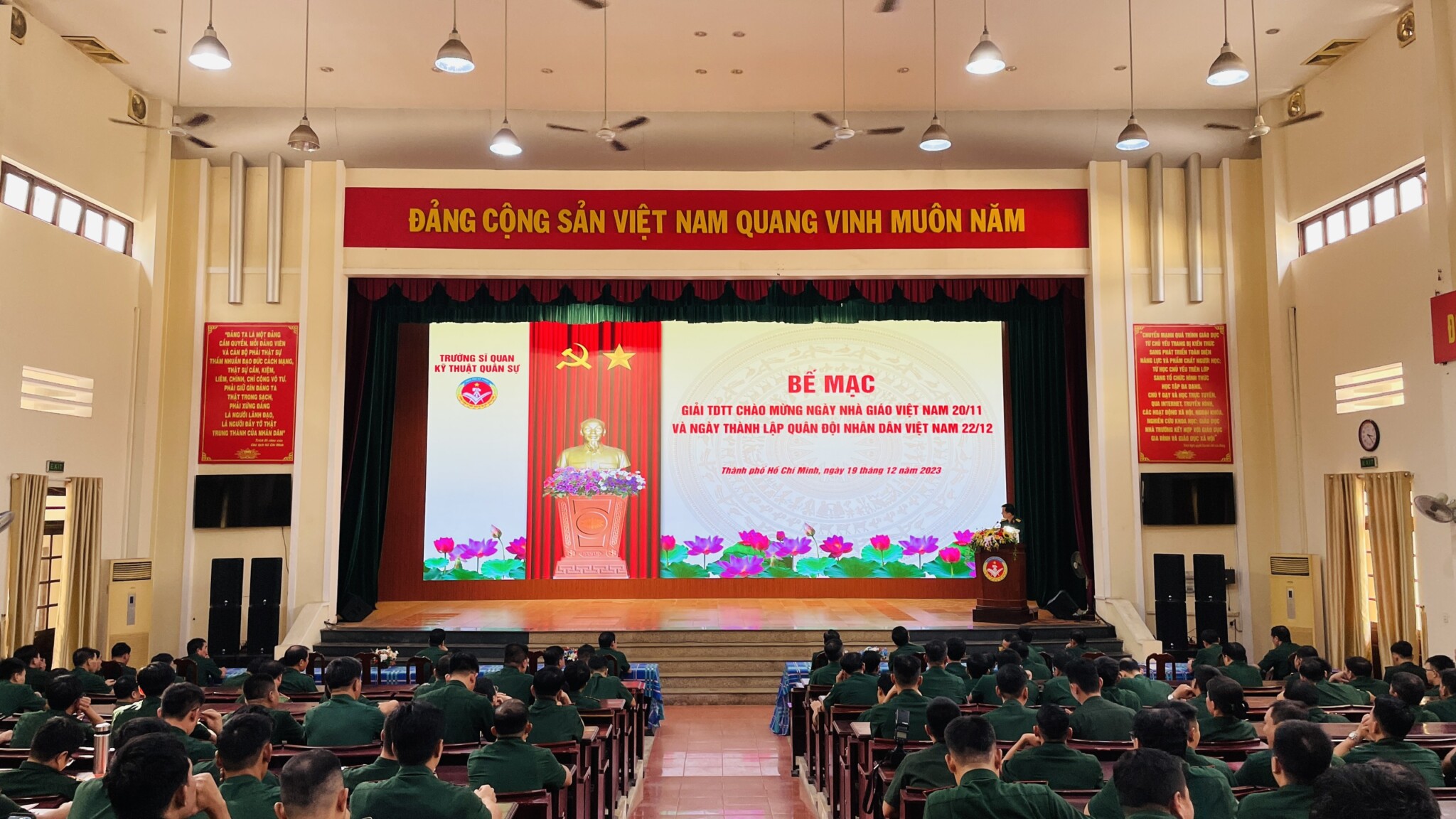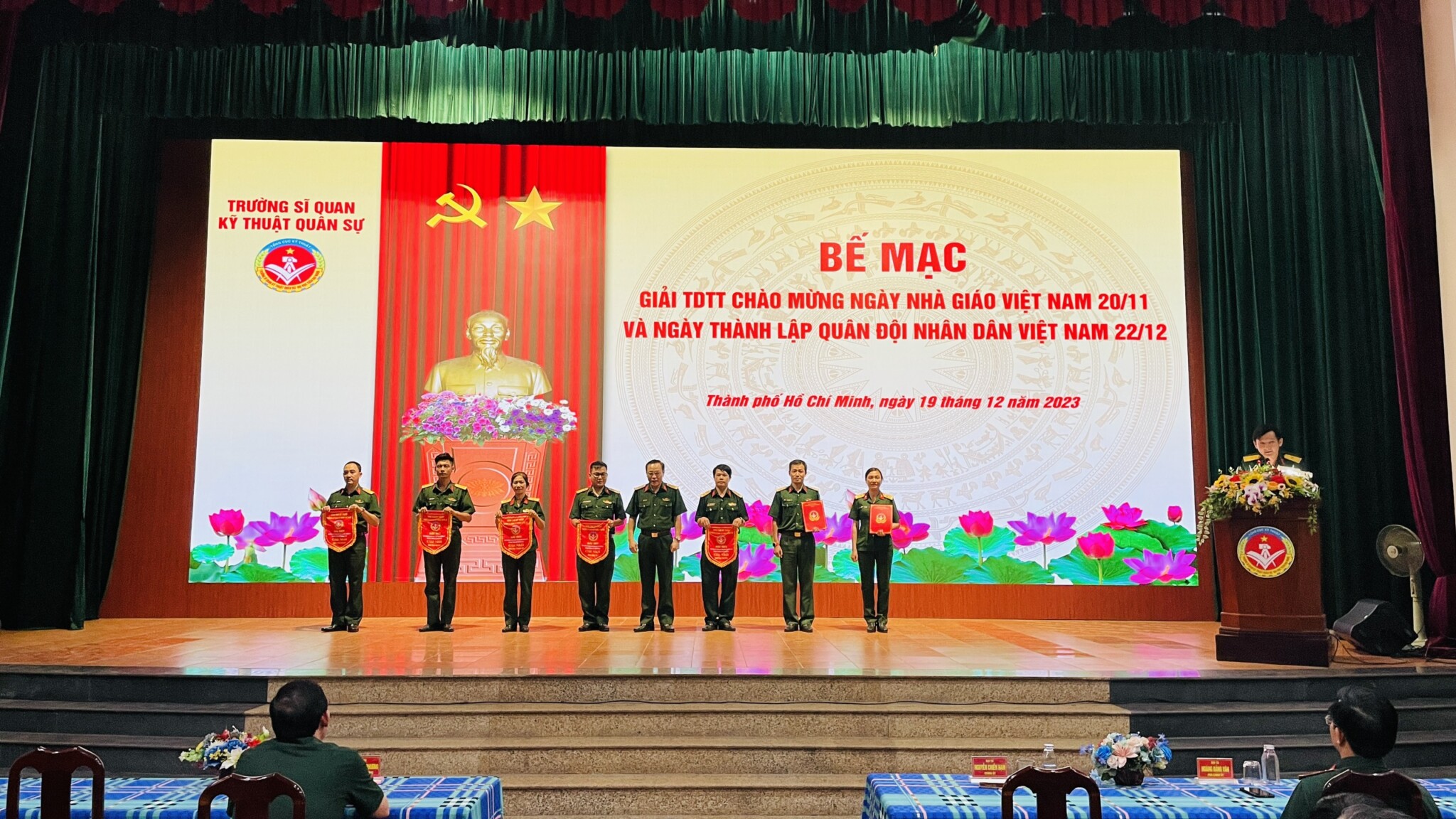 Sau thời gian tranh tài sôi nổi và quyết liệt, chiều ngày 19/12/2023, tại Hội trường lớn của Trường Sĩ quan Kỹ thuật Quân sự, Tổng cục Kỹ thuật, đã diễn ra Lễ bế mạc giải thể dục thể thao chào mừng kỷ niệm ngày Nhà giáo Việt Nam (20/11) và ngày Thành lập Quân đội nhân dân Việt Nam (22/12). Đến dự có đồng chí Đại tá Nguyễn Chiến Hạm – Chính ủy Nhà trường, đồng chí Đại tá Nguyễn Đức Phương – Phó Hiệu trưởng Nhà trường, Đại tá Hoàng Đăng Văn – Phó Chính ủy Nhà trường, cùng các cán bộ, giảng viên, học viên, chiến sĩ trong toàn trường.