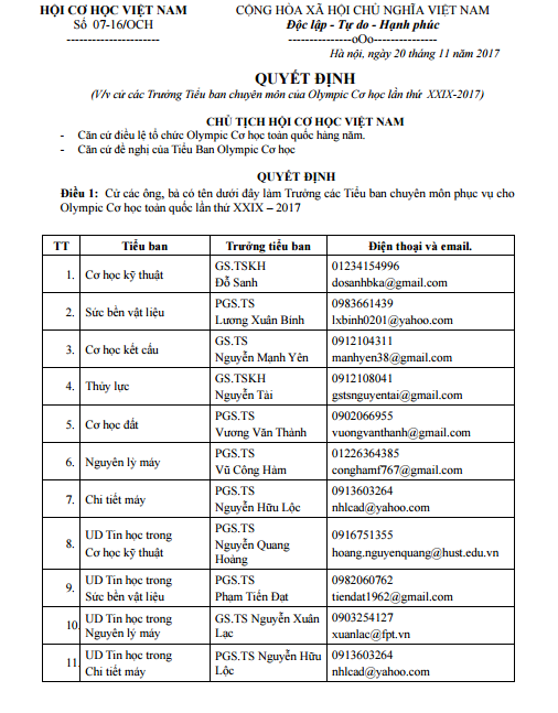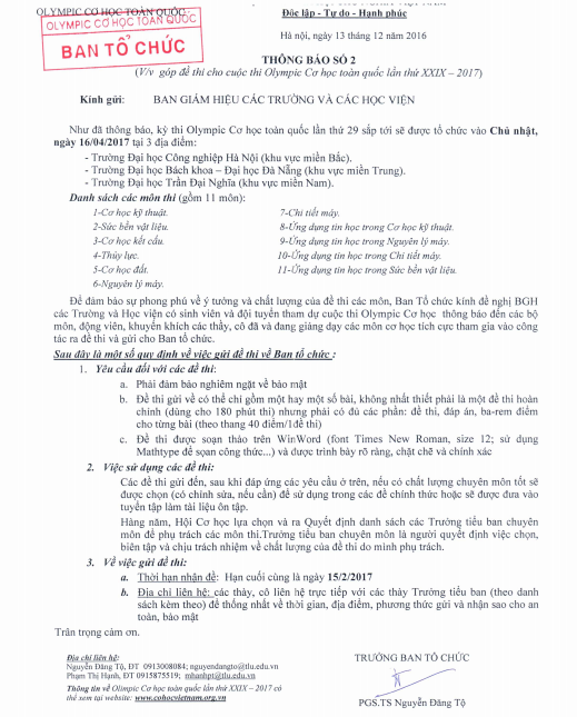 Kính gửi các thầy cô của các trường. BTC cuộc thi Olympic Cơ học toàn quốc 2017 kính gửi thầy cô thông báo số 1 về cuộc thi Olympic Cơ học toàn quốc 2017. BTC kính nhờ các thầy cô...